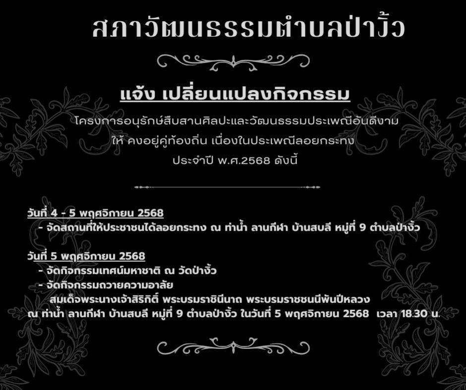 แจ้ง เปลี่ยนแปลงกิจกรรม โครงการอนุรักษ์สืบสานศิลปะและวัฒนธรรมประเพณีอันดีงามให้ คงอยู่คู่ท้องถิ่น เนื่องในประเพณีลอยกระทง ประจำปี พ.ศ.2568...