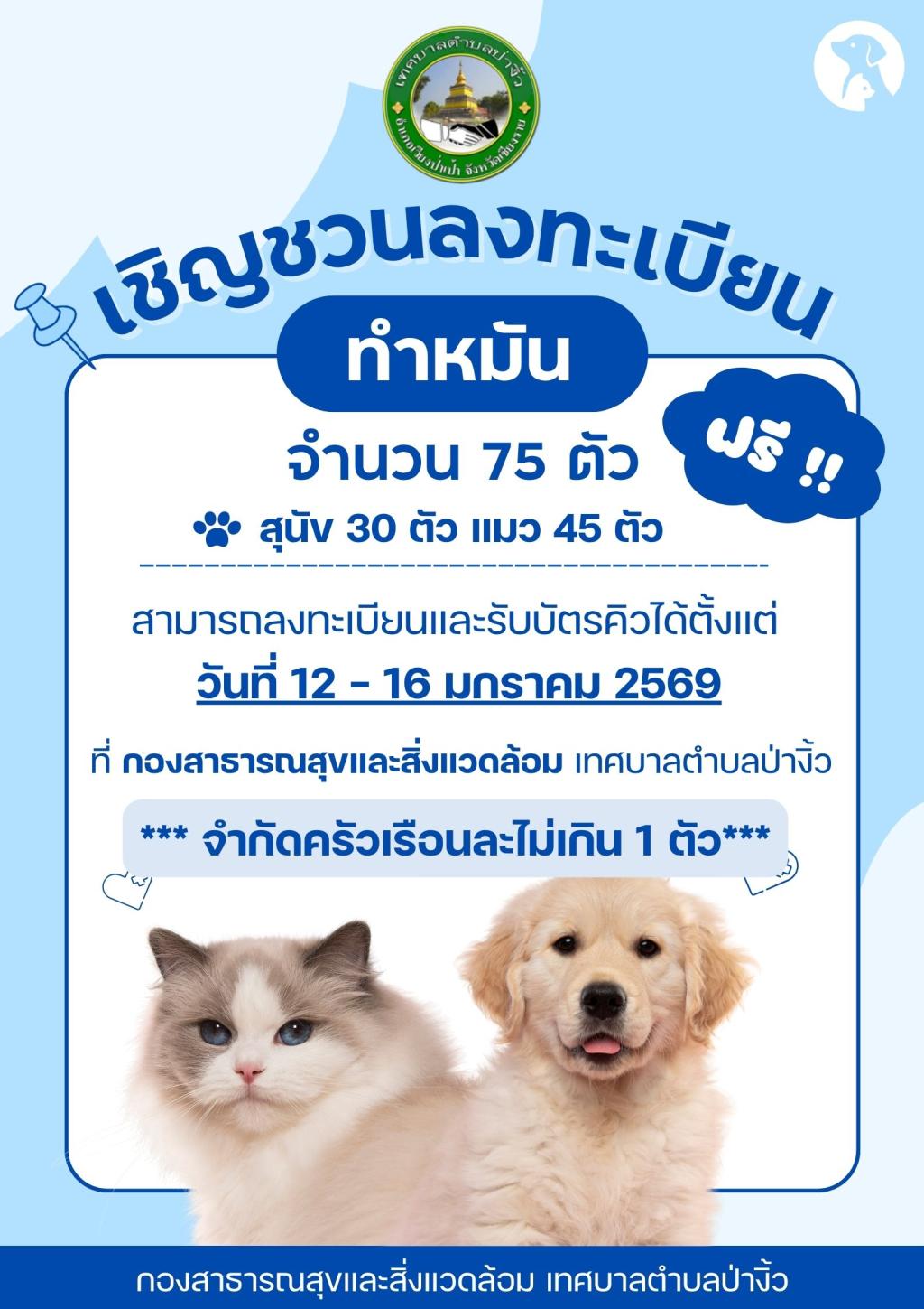 ประชาสัมพันธ์เชิญชวนลงทะเบียนทำหมันสุนัขและแมวฟรี จำนวน 75 ตัว ในพื้นที่ตำบลป่างิ้ว ประจำปี 2569...